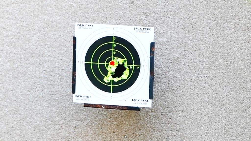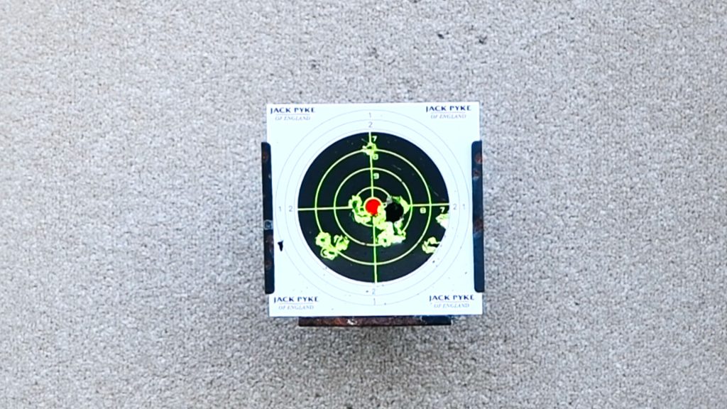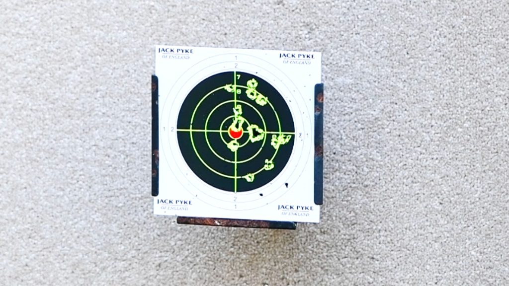 Finally for a bit of fun, Adam tried out the flip up sight and loaded with the same pellets. Placing the target out at 25m and using the lower of the two sights he was able to land plenty of shots on the target by aiming slightly below. Out of all the tests we did this one impressed us the most both in accuracy and consistency. Given that the target was extremely small within the stock sights, we were blown away with how many actually hit dead centre which is a true testament to this rifle.