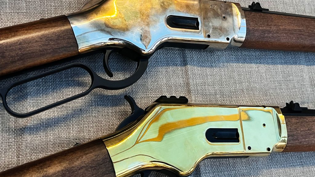 The brass frame isn’t actually brass though it is metal and the lever action is very solid and definite as you rack it.
